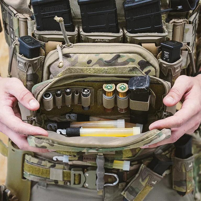 The Rear Hanger pouch by Agilite Gear opens up space that previously did not exist. It transforms the empty space on the back of a plate carrier into a low-profile pocket that can be accessed with one hand. It holds firmly, does not obstruct and additionally provides lumbar support during long wear.