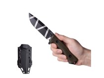 | Other specifications | Edge: straight Blade steel hardness: 59 HRC to 60 HRC Full tang construction Simple guard on the handle (extended on the blade) Shaped handle with texture for a firm and secure grip Jimping on the back of the blade transitioning to the handle allows the user to apply pressure to the blade and guide the knife with the thumb or index finger, and jimping on the back of the handle allows for guiding the knife with a braced palm Glass breaker at the end of the handle Hole at the end of the handle for a safety cord Made in the Czech Republic |
