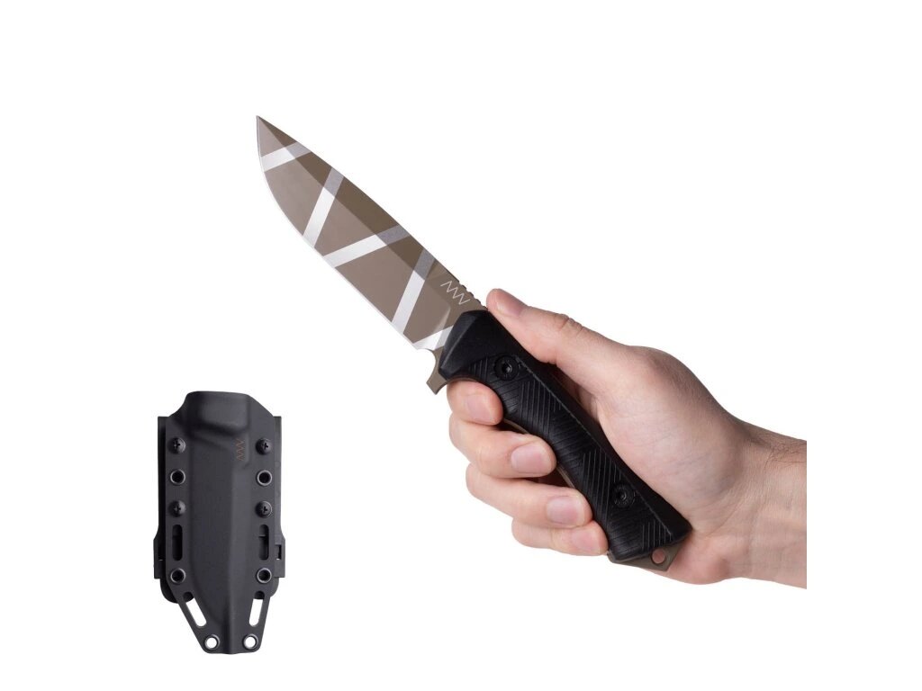 The heart of the P250 is a 5.5 mm thick blade made from Sleipner tool steel, cryogenically hardened to a hardness of 59-60 HRC. Thanks to the Cerakote coating in Black Camo camouflage pattern, the blade is not only resistant to corrosion and wear but also minimizes reflections, which is appreciated during tactical operations. The drop point blade shape with a flat grind ensures excellent cutting properties and versatile use.
