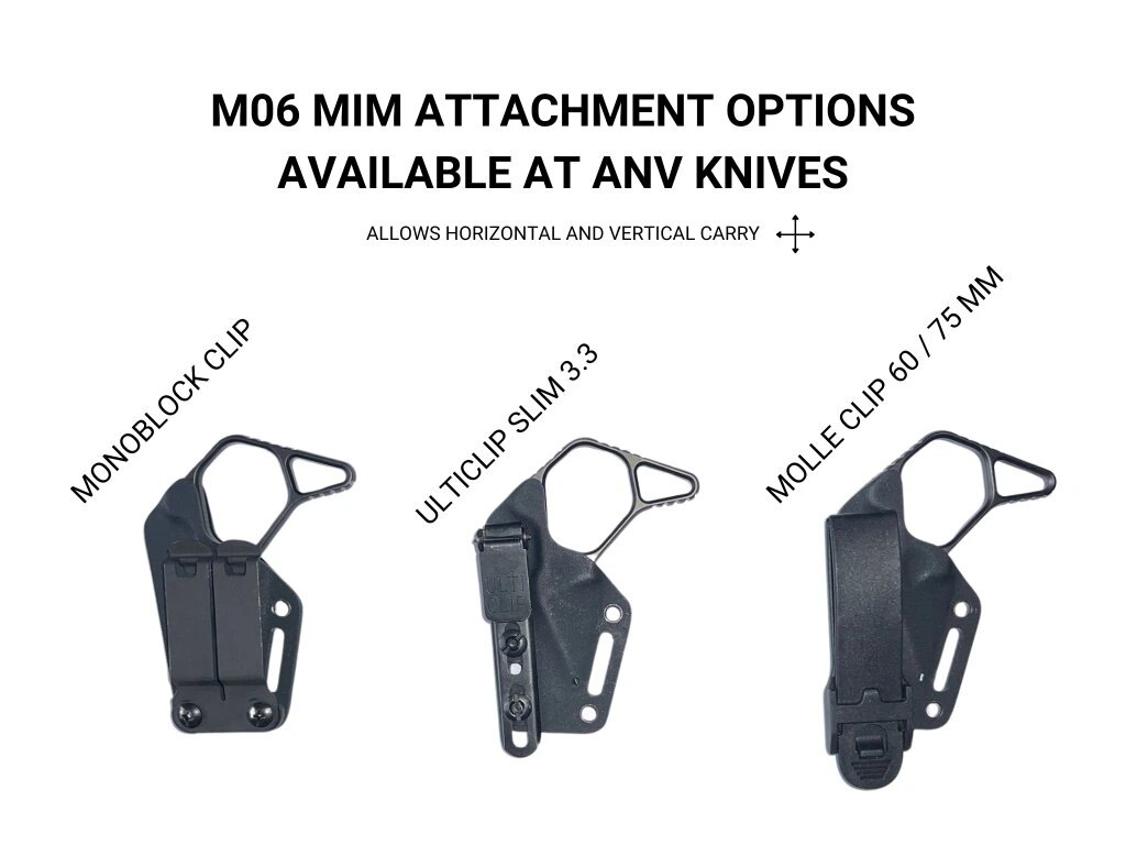 The ANV Wharncliffe M06 claw can be carried in a variety of ways, including carrying it on a belt using the DCC monoblock clip. However, alternative variants such as Slime Line ulticlip or MOLLE clip are also available. So you can wear the claw in a horizontal position or combine it with tactical vests or combat belts. Hollow rivets and housing holes allow for multiple angled connections with varying rivet and mounting hole center distances.
