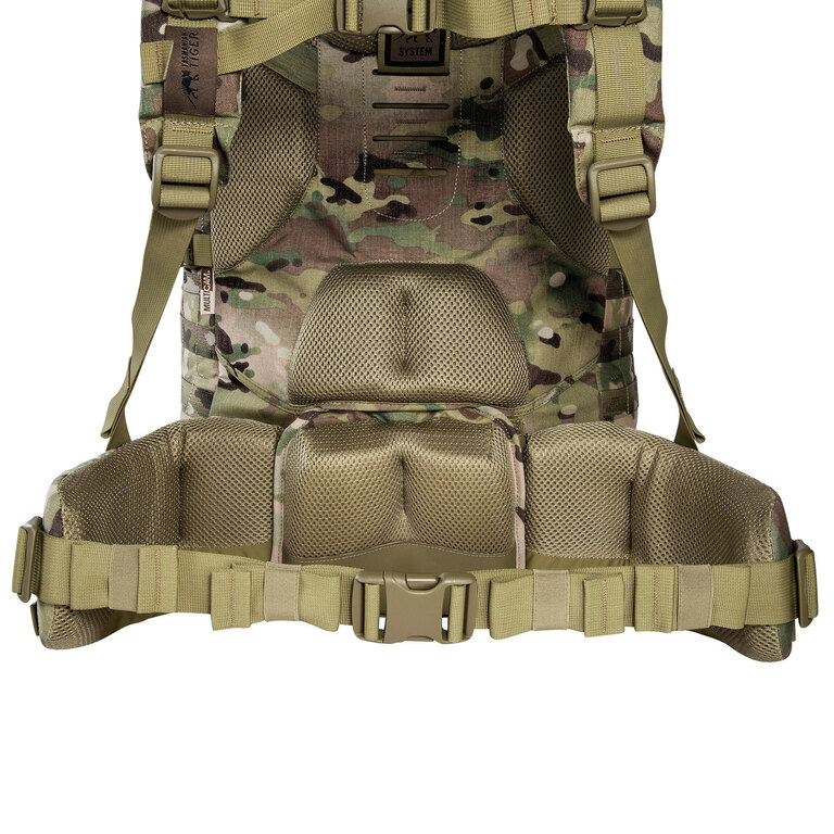 The V2 Plus carrying system is adjustable to torso length and designed for efficient load transfer. Shoulder straps, a height-adjustable chest strap, and a removable hip belt keep the backpack stable and comfortable during prolonged use. The hip belt can also be detached and used separately as a Warrior Belt.