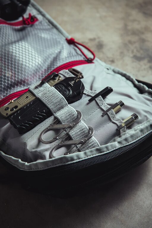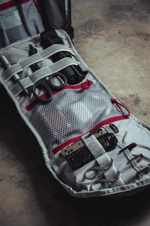 The light-colored interior lining improves visibility even in low-light conditions. Mesh pockets, gear slots, hook-and-loop panels, and attachment points keep equipment organized and easy to locate. The front admin pocket includes slots suitable for magazines, first aid supplies, or EDC gear, along with elastic retention loops for modular accessories. A dual-layer padded compartment protects laptops and other electronics. Additionally, a side pocket with internal organization provides convenient storage for bottles, hydration equipment, or frequently used gear. A separate top pocket with soft tricot lining protects glasses and small items that need quick access without opening the main compartment.