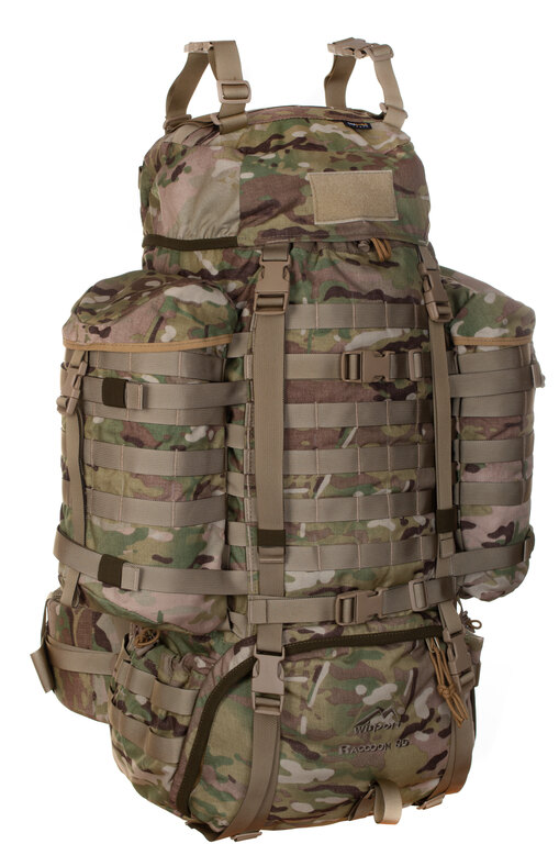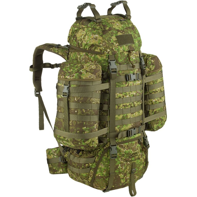 | Other specifications | Hydration bladder compatible Carrier system: FAS Plus Evolution (Military) (fully adjustable system) Aluminum frame with black surface finish Reinforced stitching for higher durability Spacious main compartment with a top drawstring entry covered by a lid Removable lid, expansion sleeve A zipper-attached divider splits the main compartment into 2 areas - the lower approximately 1/3 has its own access closed by a two-way zipper from below 2 side removable pockets with a capacity of 9l each 2 side pockets with a drawstring top entry at the bottom 2 pockets in the lid Compression straps (2 on each side and 4 at the front - 2 horizontal and 2 vertical) Transport straps at the top and bottom Velcro panel on the lid MOLLE compatible webbing on the front, on the sides, on the side pockets (both on the lower and upper removable ones) |