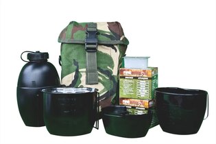 The whole set contains a textile cover in the DPM Woodland design, a smaller flint & striker, a mug, 2x mess tins, a cooker and solid fuel.
