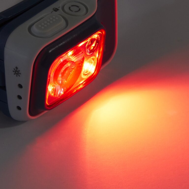 | Other specifications | Number of LED diodes: 3 (large white, small white, small red) Available modes: white light of different intensities, red light, white and red strobe, red SOS signal Direct and angled illumination Maximum illumination time: 225 h Controls: 2 buttons on top of the flashlight + PowerTap™ technology on the right side of the flashlight for switching between full and dim light Memory settings Lock mode safety function Battery indicator on the side of the flashlight (3 blue LED diodes - 6 battery levels indicated by their glowing or flashing) Protection: IPX8 (can withstand depths of 1.1 m for 30 min; dry the battery compartment after use in wet or humid environments) Operating temperature: -17 °C to +43 °C Can also be attached to a backpack sternum strap, to another strap on a backpack or bag, etc. Headband can be hand washed and left to dry freely |