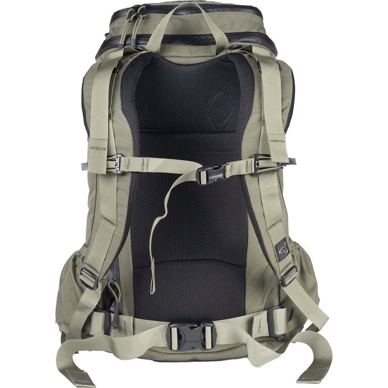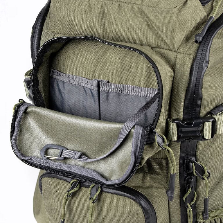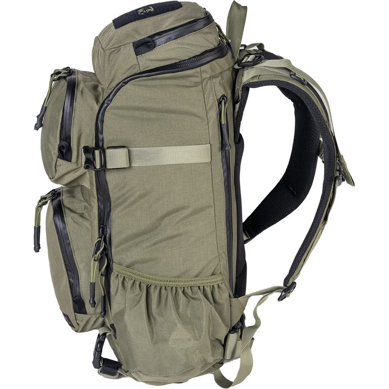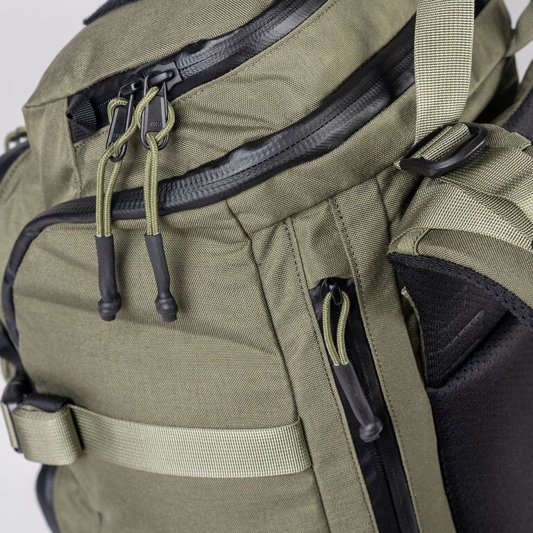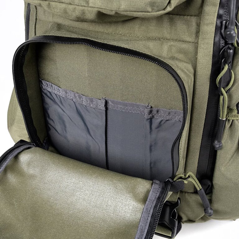 Internal PALS webbing allows for modular organization and attachment of additional gear based on current needs. Side and bottom compression straps stabilize the load and keep it close to the body, while side pockets with drainage grommets handle wet or dirty items.
