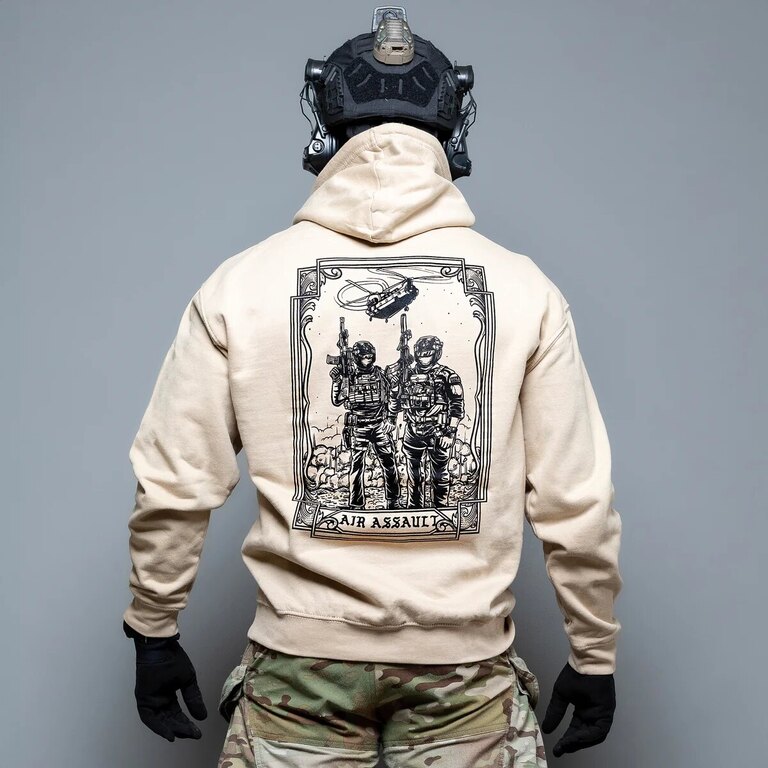 The Air Assault hoodie is a tribute to those who don't get into action through doors – but fall from the sky. The design was created in collaboration with brothers in arms from Trace and honors the paratrooper units. Whether you just support paratroopers or are personally involved, this piece speaks for you.