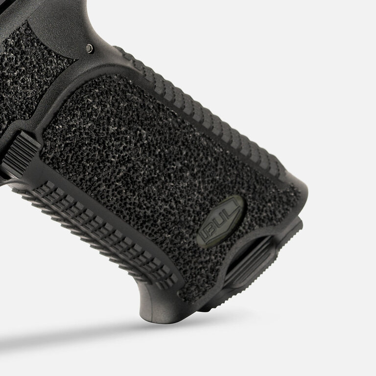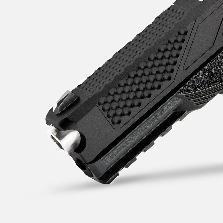 The bolt of the gun has Hatchet-style serrations on the front and back. The frame of the weapon has a high and extended beaver tail, the trigger has a double recess – the so-called undercut. There are thumbrests on both sides of the frame. All this for a firm grip.