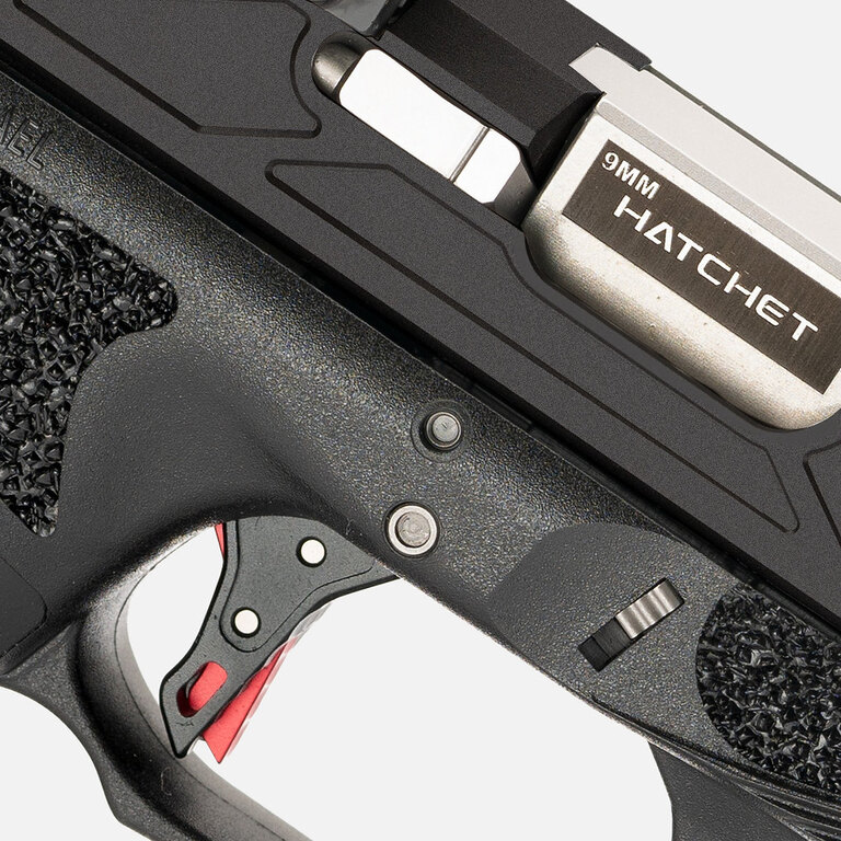 The BUL AXE FS Hatchet pistol / 9×19 caliber has an enlarged bolt catch and magazine catch with the option of selecting the side. The gun's mounting pins are stainless steel and have dimples for easier disassembly.