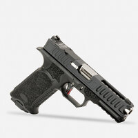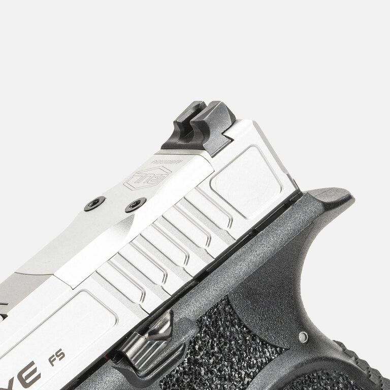 The bolt of the gun has Tomahawk-style serrations on the front and back. The bolt is generally lightened by an elegant recess. The frame of the weapon has a high and extended beaver tail, the trigger has a double recess – the so-called undercut. There are thumbrests on both sides of the frame. All this for a firm grip.