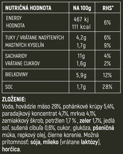 Inside is a combination of tender pieces of beef and spicy goulash, complemented by fluffy buckwheat porridge. No substitutes, just honest ingredients that satisfy and energize. It tastes traditional but keeps up with the pace of today's world – just a few minutes and it's ready.