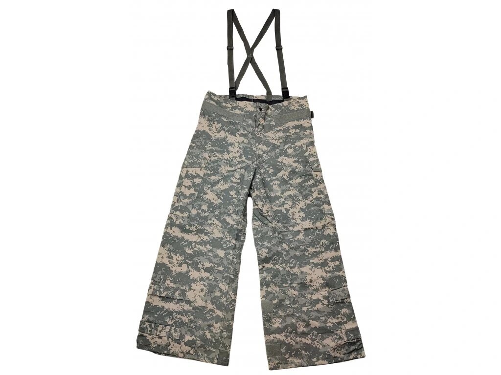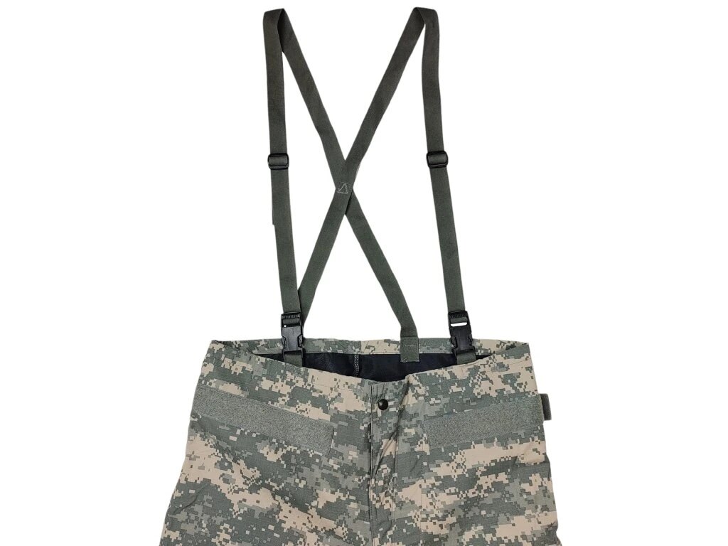 The trousers have a higher waist and include adjustable suspenders to help maintain proper positioning when worn with additional gear. Hook-and-loop adjustments at the waist and leg openings allow for individual fit customization. Two thigh pockets provide space for small essentials.