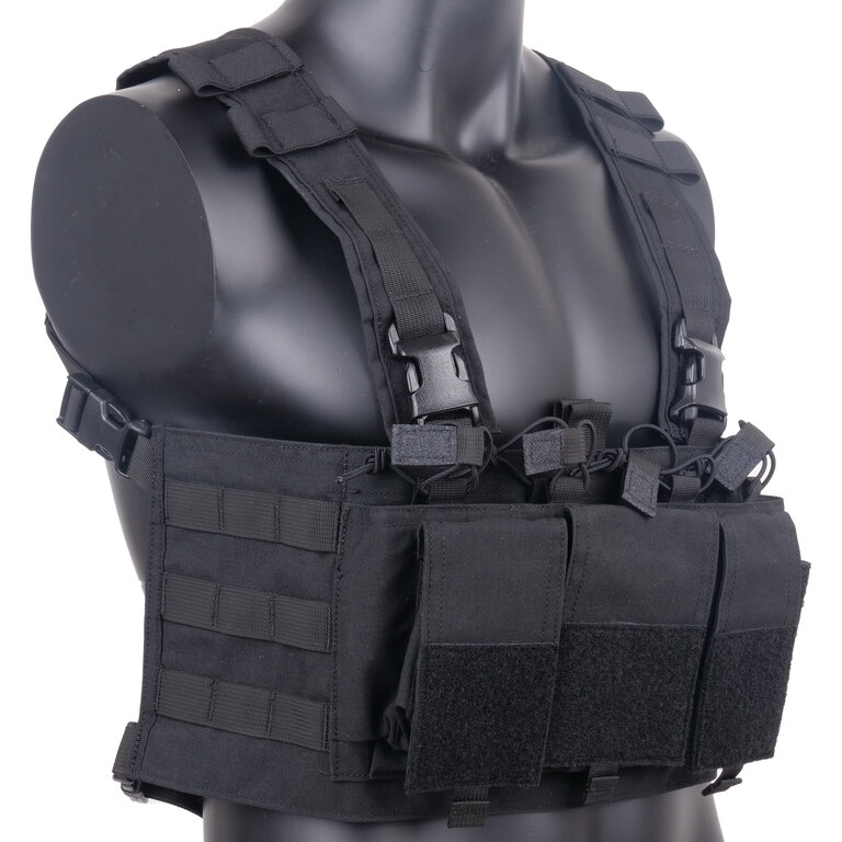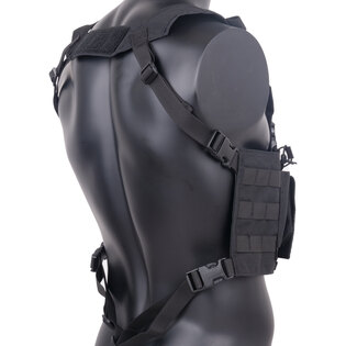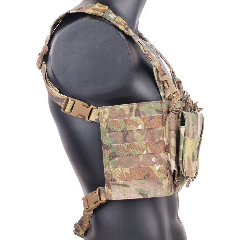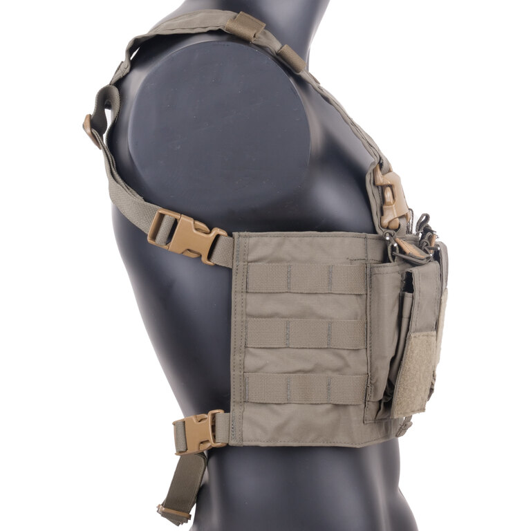 On the sides you will find three rows of MOLLE / PALS bindings for further extension.Shoulder straps are equipped with loops to route antennas, communication wires, or hydration system tubing. The entire rig is removable via 4 side buckles ITW-Nexus. Chest Rig is designed to be mounted to the front of the low profile plate carrier. It comes with a standard H-Harness, but is also compatible with Ultracomp 2 H-Harness or Ultracomp 3 H-Harness.