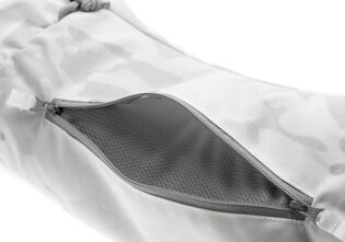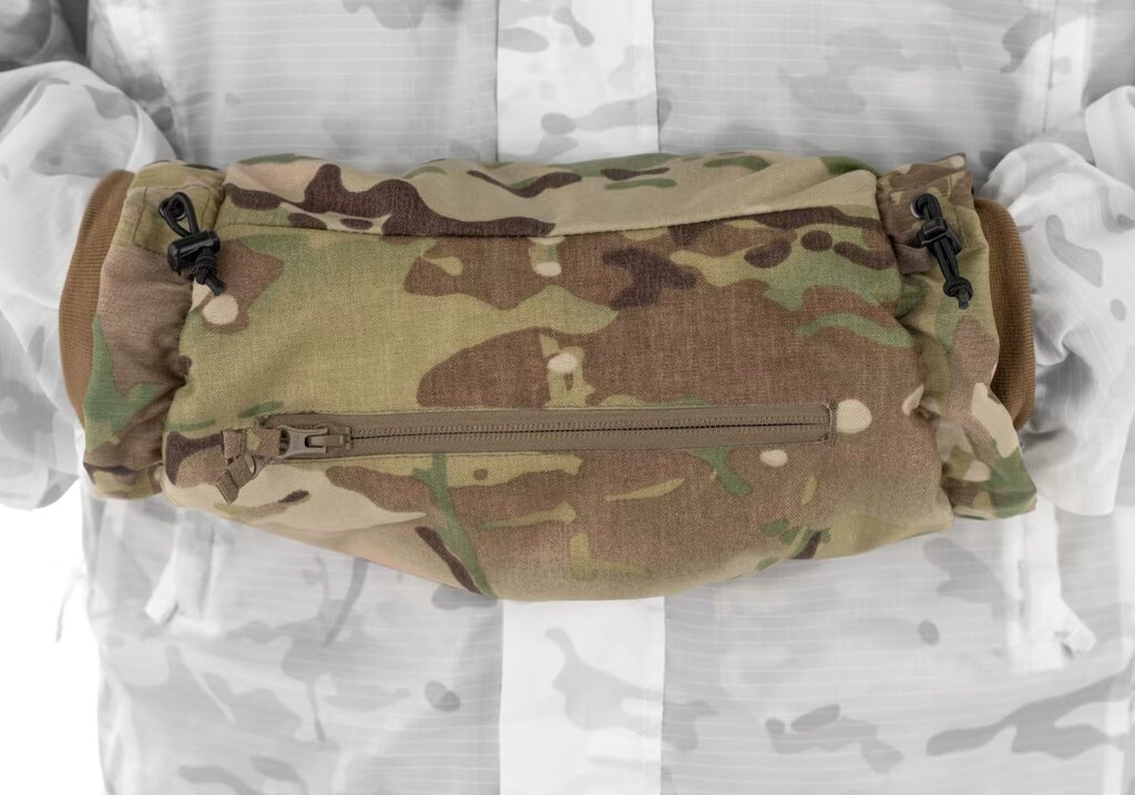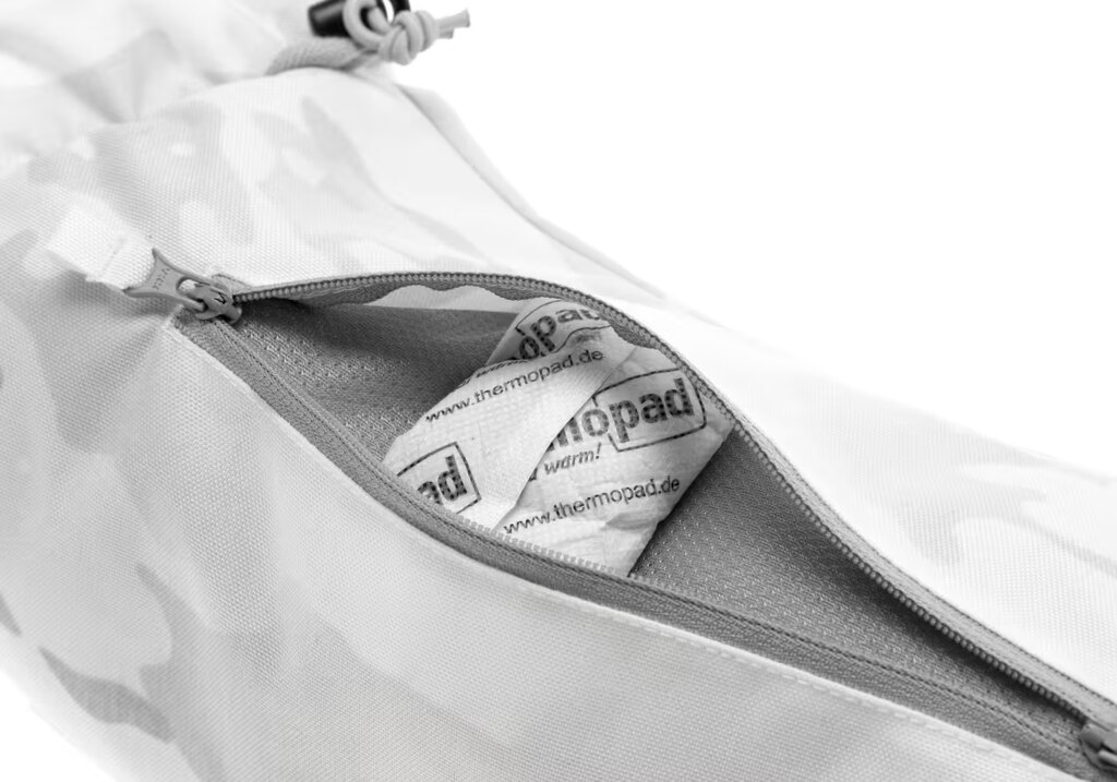 A front zippered pocket with a YKK® zipper provides space for small items or chemical hand warmers. The rear panel includes four MOLLE-compatible attachment loops, allowing the warmer to be mounted to belts, vests, or other load-bearing equipment.