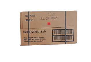 This box contains Menu A of U.S. military MRE rations. Inside are twelve different main entrées that form the core of each individual ration. Each meal is packaged separately, allowing the rations to be used gradually according to current needs.