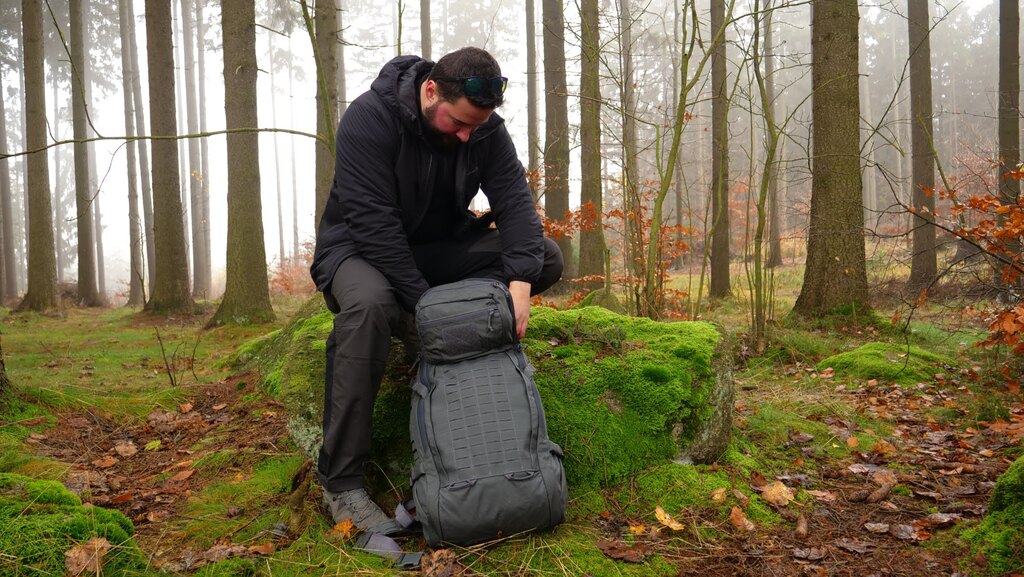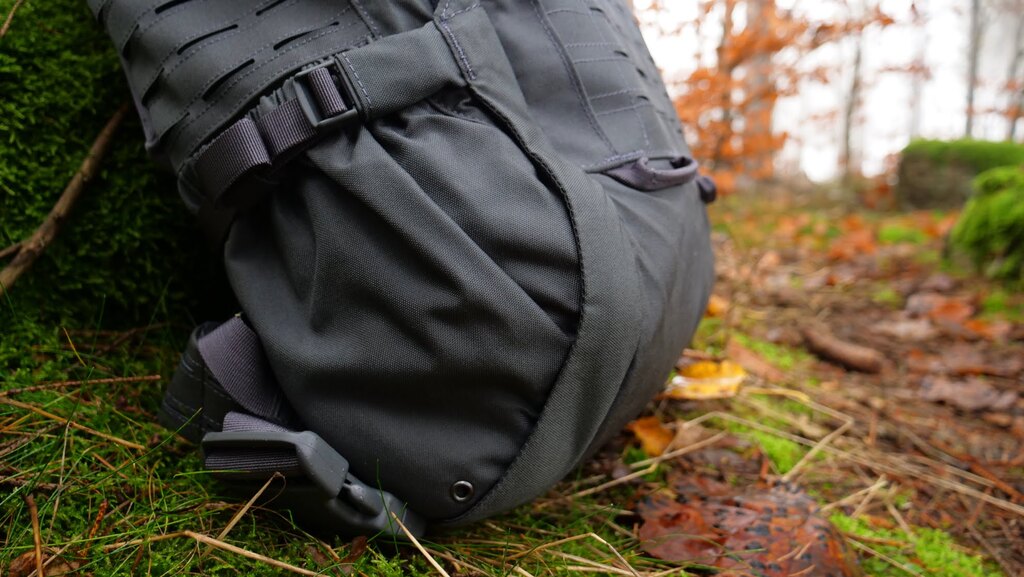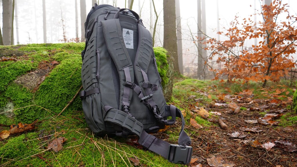 The chest and waist belt is fastened with a durable quick-release buckle. The waist belt, like most backpacks, is complemented by an additional MOLLE webbing. If you do not use the waist belt, it is not a problem to store it in special side pockets. This gives you a wide range of customization options in combination with other MOLLE compatible accessories. The largest area with MOLLE webbing is located on the sides and back of the backpack. There are so many places where you can add other equipment.
