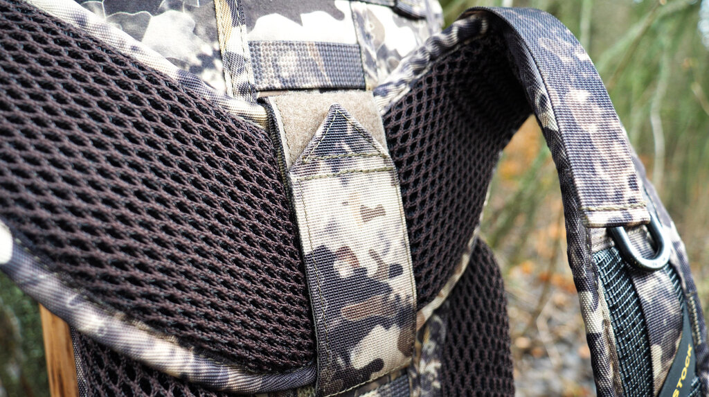 The patented integrated scabbard system allows you to carry your hunting rifles comfortably without using your hands. The scabbard is located right next to the back panel for efficient distribution of weight. If you do not carry any gun, the space can be compressed using compression straps which also serve as stabilization straps, the bottom of the scabbard can be rolled up and secured with a buckle.
