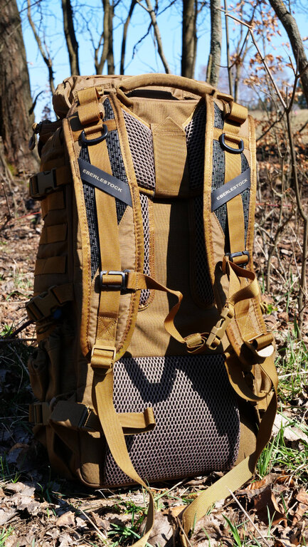 Just like all other Eberlestock backpacks, the Little Brother is also equipped with quality shoulder straps, which are sufficiently padded yet breathable due to the used 3D mesh material. In addition to that, the shoulder straps may be compressed using stabilization straps so as to adjust the distribution of weight and pressure on the shoulders. The back padding is sufficient and the central channel leaves enough room for the air to circulate around the spine. The pack fits comfortably even during long hikes. On the shoulder straps are several additional loops for the attachment of additional gear. The pack has one massive carry handle on the top. An elastic sternum strap adjustable in height will help you better distribute the carried load. Since the Little Brother has been designed as a complement to the bigger Warhammer back or J79 system, it is not equipped with a waist belt nor vertically adjustable back system. Nevertheless, the back padding is designed so as to accommodate any type of belt and the shoulder straps may be detached in order to attach the pack to the larger Warhammer or J79 system.