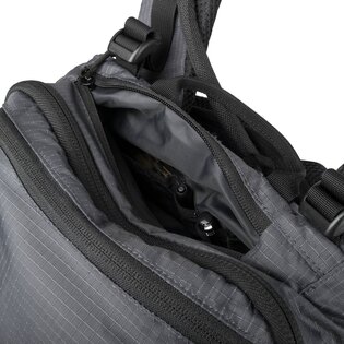 The back part is padded, reinforced and covered with mesh for the optimal ventilation. Two anatomically shaped shoulder straps with the elastic loops, chest strap and waist belt with the fasteners all add to the equal distribution of the carried weight.