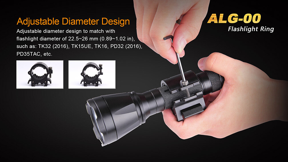 The Fenix ALG-00 mount is compatible with selected flashlights of the same brand with a body diameter of 22.5 - 26 mm. These are, for example, the following flashlight models: TK09, TK11 TAC, TK15, TK16 V2.0, TK20R V2.0, TK22 UE, TK22 TAC, TK25 IR, TK25 R&B, TK25 Red, TK25 UV, TK26R, HT18, HT30R, PD32 V2.0, PD35, PD36R, PD36R PRO, PD36 TAC, UC35 and FD41.