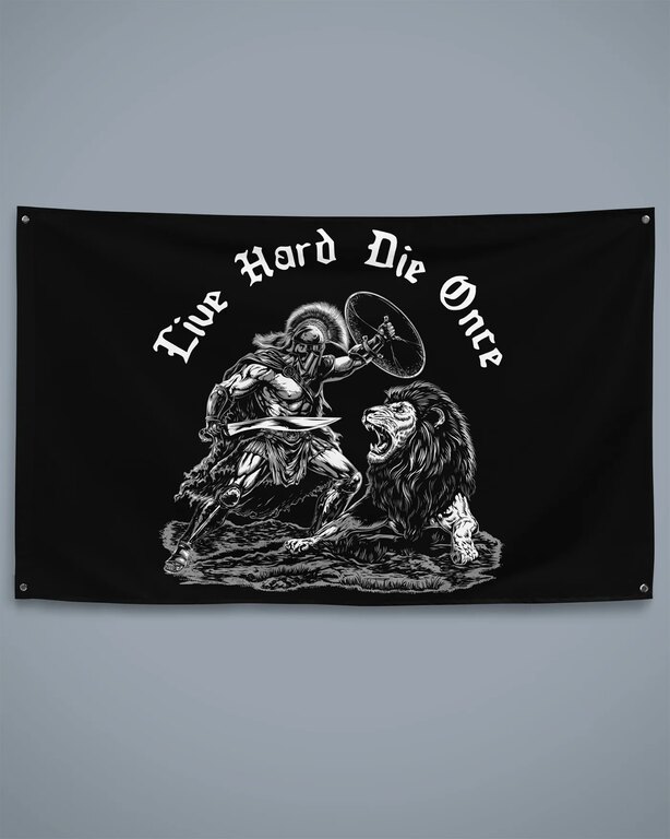 The “Die Once” motif is presented with sharp contrast and clear typography. The design stays readable at a distance and adds a strong visual accent to any interior environment where minimalist tactical style fits naturally.