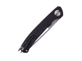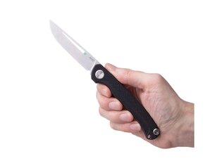 The G10 handle combines two surface textures. The rougher upper section along the spine improves grip security, while the smoother lower section enhances comfort during extended use. An index finger cutout supports hand positioning and partially functions as a guard. Despite the knife’s low weight, the longer handle ensures a stable grip.