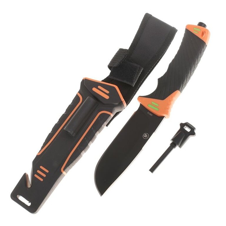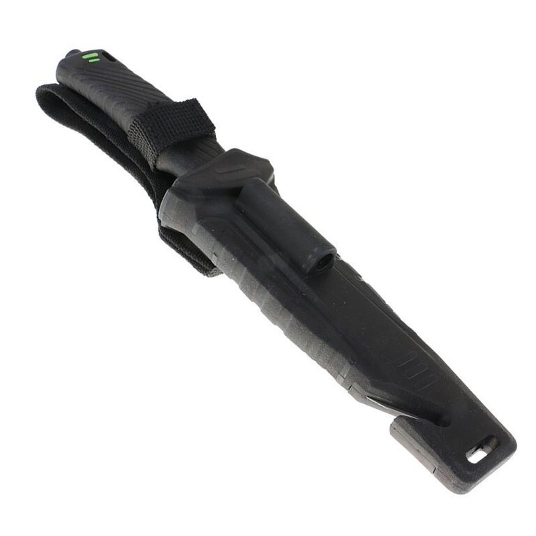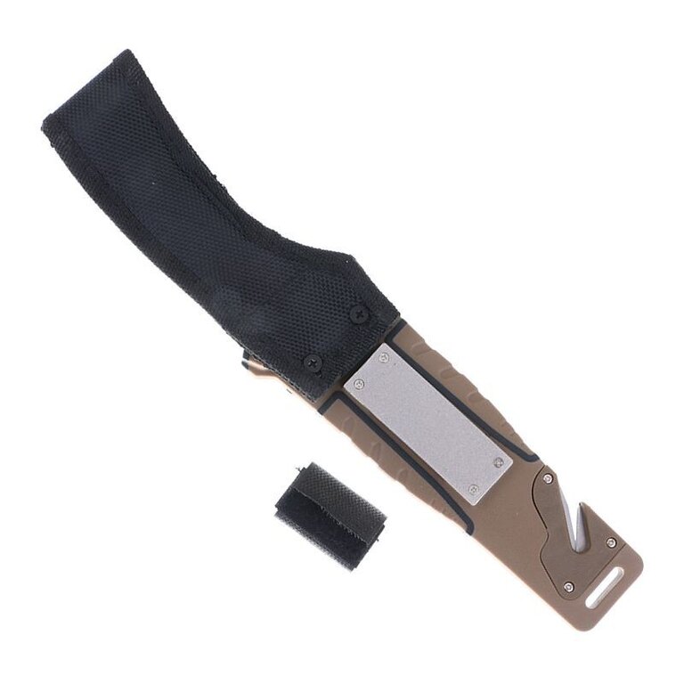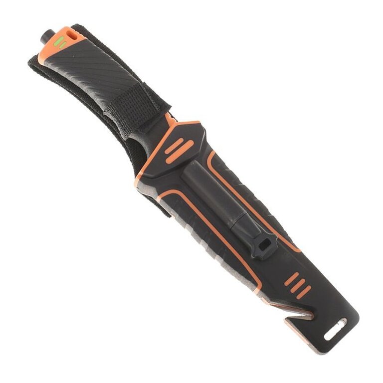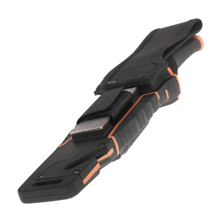 The knife comes with a case made of ABS plastic in combination with Cordura. In addition to allowing comfortable carrying of the knife on the belt, it hides another surprise. A magnesium flint is attached to the outside of the sheath, which you can use to start a fire or light a gas stove. On the lower edge of the case there is a cutter for safety belts, straps or ropes. On the back of the case there is a practical sharpener with a diamond coating, protected by Velcro.
