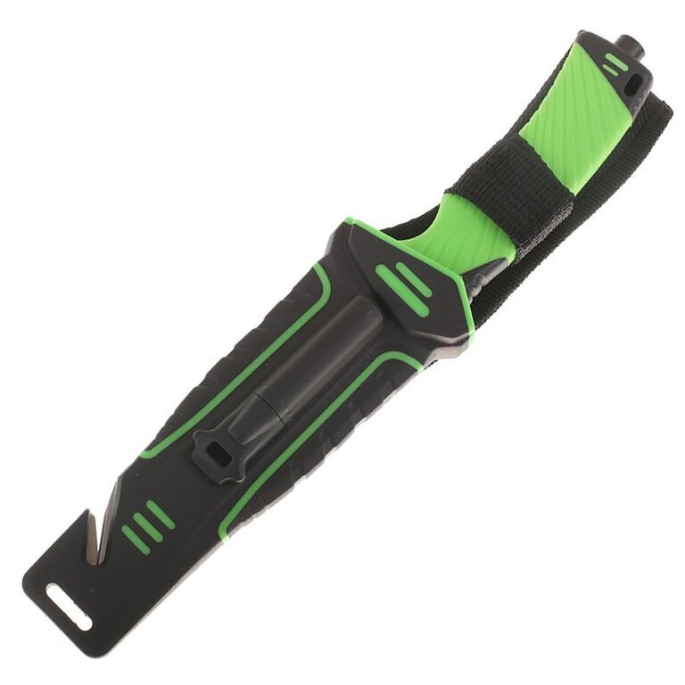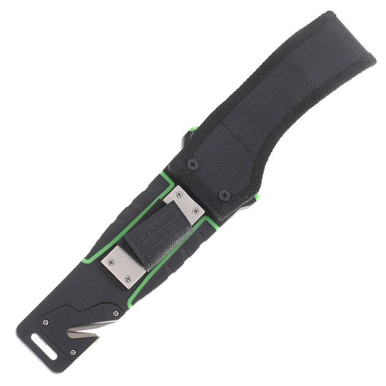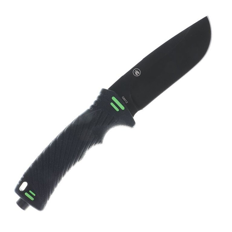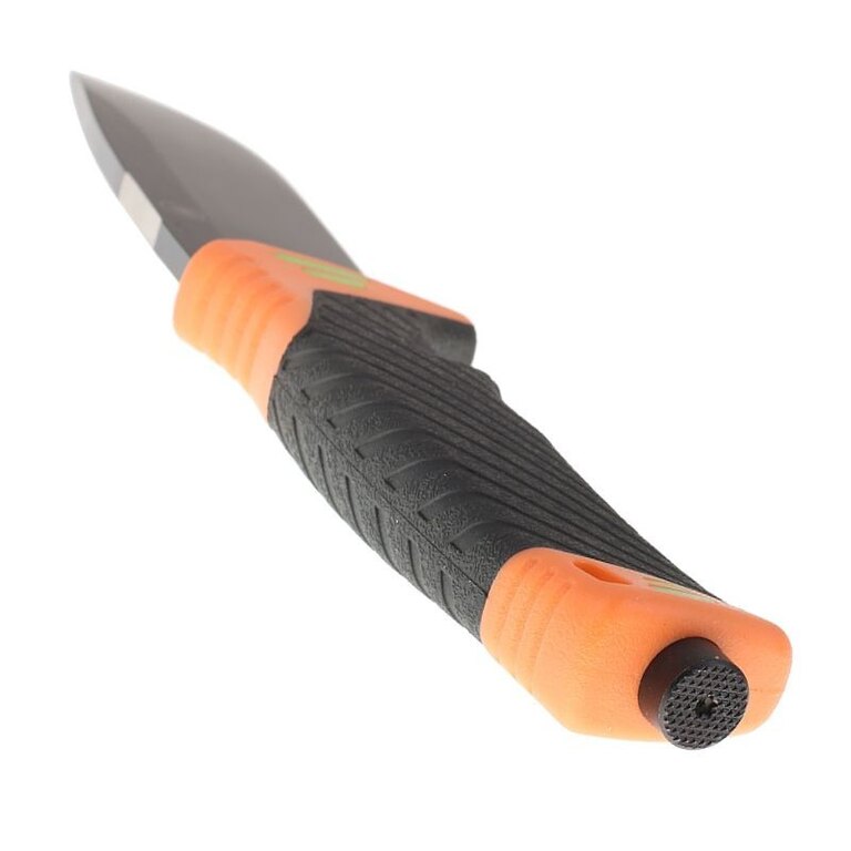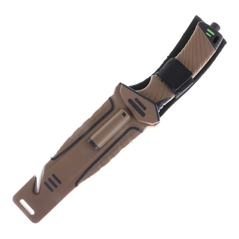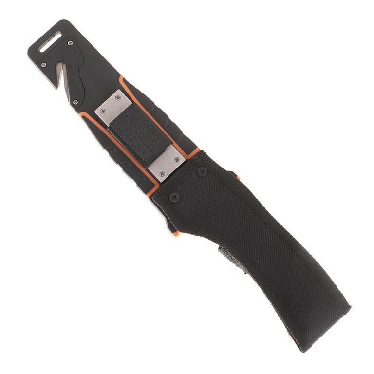 The knife comes with a case made of ABS plastic in combination with Cordura. In addition to allowing comfortable carrying of the knife on the belt, it hides another surprise. A magnesium flint is attached to the outside of the sheath, which you can use to start a fire or light a gas stove. On the lower edge of the case there is a cutter for safety belts, straps or ropes. On the back of the case there is a practical sharpener with a diamond coating, protected by Velcro.