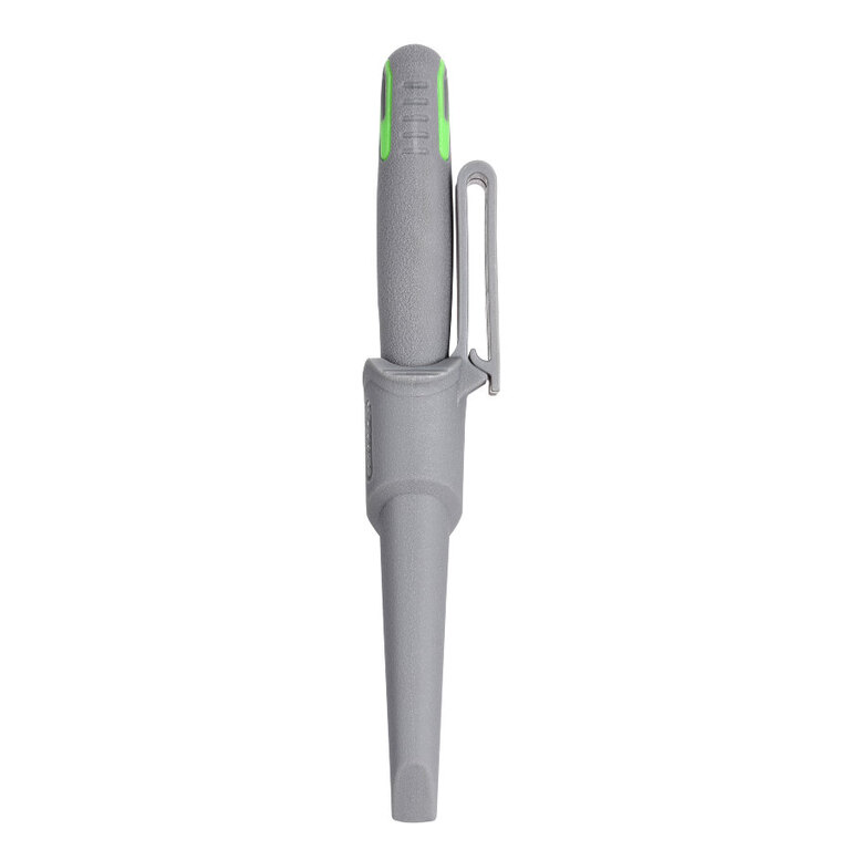 You'll get a lightweight plastic sheath with the knife. It's suitable for carrying on a belt, in a backpack or attached to equipment. The knife holds securely in it and is always quickly at hand – no searching through stuff.