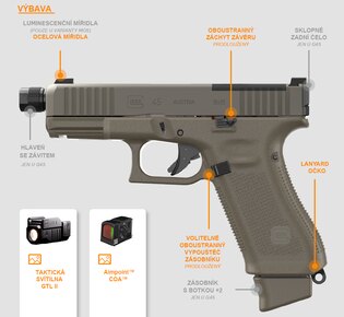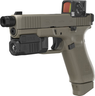 In this configuration variant, the Glock 45 pistol is equipped with a GTL II flashlight, complementing the weapon setup with reliable illumination for working in low visibility and rapid target identification. The flashlight installation respects the basic ergonomics of the pistol, so the control elements remain accessible and handling intuitive.