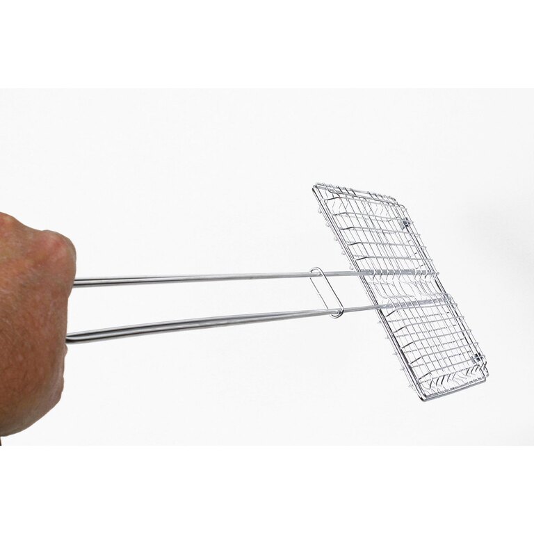 The hinged, lockable basket firmly holds food during cooking, making it easy to flip and handle without losing contents. This design is ideal for camping, bushcraft, and casual outdoor grilling.