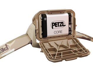 The headlamp includes a rechargeable CORE battery and is also compatible with three AAA batteries. Thanks to HYBRID CONCEPT technology, it automatically detects the power source and adjusts performance accordingly. AAA batteries provide extended runtime, while the CORE battery ensures higher consistent output.