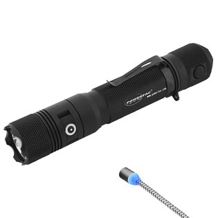 | Other specifications | Beam intensity: 73 750 cd Controls: tail and side switch Quiet switch = no loud clicking sound like most tactical light on market Crenellated bezel for selfdefence Settings memory Double coated glass lens to provide maximum brightness and beam distance Digitally controlled circuit technology Superior heat sink designed for quick heat dissipation Reverse polarity protection (incorrect battery insertion) Low battery indicator / charge status indicator (red / blue) Innovative dual charging - magnetic port or micro USB port (waterproof) Waterproof: IPX 8 - withstands immersion to depth of 2 m (manufacturer does not state time) "O" rings sealed Impact resistance: up to 1,5 m Tempered glass to resist breaking and scratching upon impact |