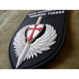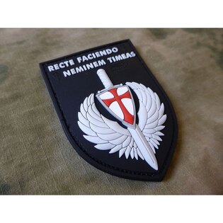 The dominant element of the patch is a combat shield and sword, symbolizing courage and justice. The Latin motto RECTE FACIENDO NEMINEM TIMEAS gives the patch a deeper meaning and can serve as a personal motto for the wearer.