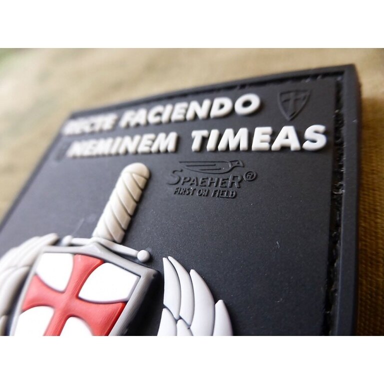 A patch with the Latin motto RECTE FACIENDO NEMINEM TIMEAS (translated as Do what is right and fear no one) and a design featuring a combat shield and sword. The high-quality 3D design made from PVC material ensures durability and longevity.