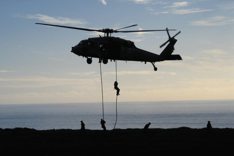 Rappelling from a helicopter during the Navy SEALs course. Source: Michal Ščepko and NSWC