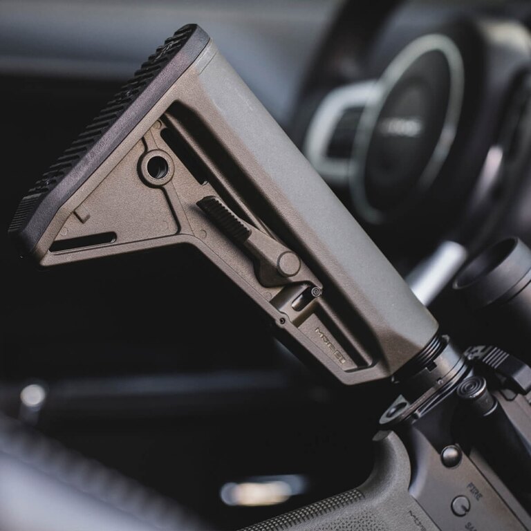 The MOE SL Carbine Stock Mil-Spec from Magpul (MOE Slim Line) is a replacement stock for AR15/M4 carbines that use Mil-Spec size receiver extension tubes. The stock is made in the USA.