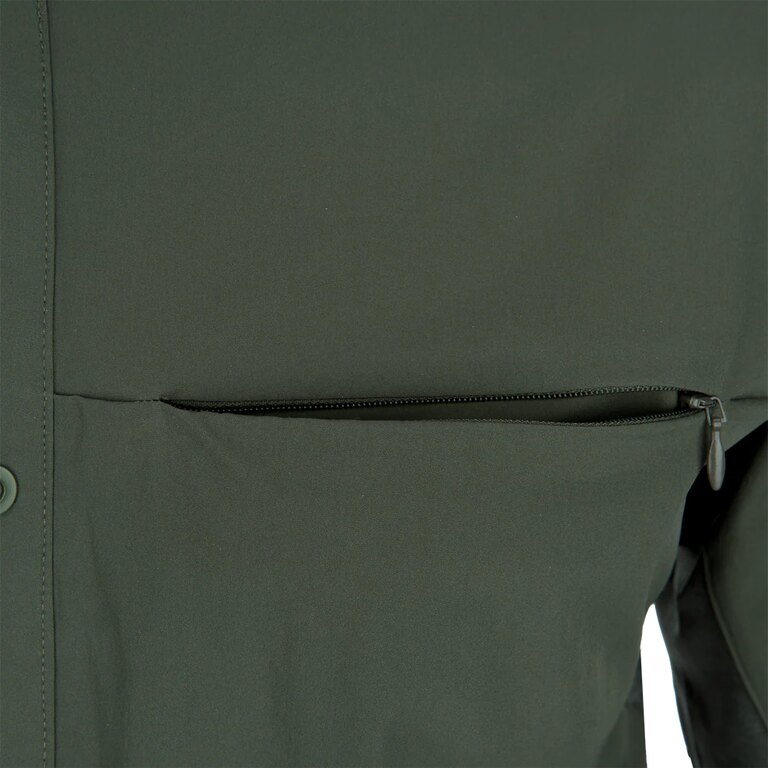The shirt features several discreet pockets, including a zippered chest pocket, a zippered sleeve pocket, and two small pockets integrated into the bottom hem. These provide convenient storage for small essentials while keeping items secure and easily accessible. The design is also compatible with concealed carry (CCW), allowing comfortable access to gear when needed.