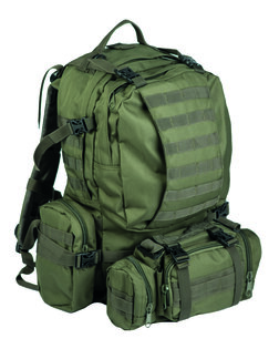 | Other specifications | Padding on the back of the backpack MOLLE compatible webbing on the front and sides of the backpack and on all additional pockets 4 compression straps – 2 at the top and 2 on the sides (across the main compartment zipper) 4 "D" rings – 2 on shoulder straps (1 on each) and 2 at the top near the handle (1 on each side) --- Voluminous main compartment fastened with a durable two-way zipper covered by a flap Pocket with open top entry (for laptop) on the back inside the main compartment Front pocket fastened with a two-way zipper covered with a flap Mesh pocket with open top entry inside the front pocket Front extra accessory pocket with several small zippered pockets – usable separately as a shoulder bag 2 side accessory pockets with zippers with an internal pocket with an open top entry All extra accessory pockets usable separately attached to the supplied strap or other gear with MOLLE compatible webbing |