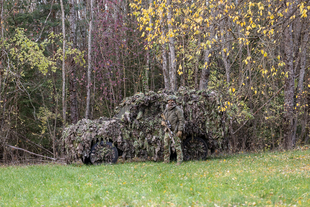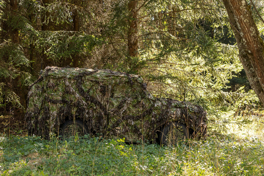 The textile material is lightweight, breathable, and easily packable, minimizing additional load on the vehicle and crew. The system is designed for rapid deployment and can withstand movement through vegetation without restricting maneuverability.