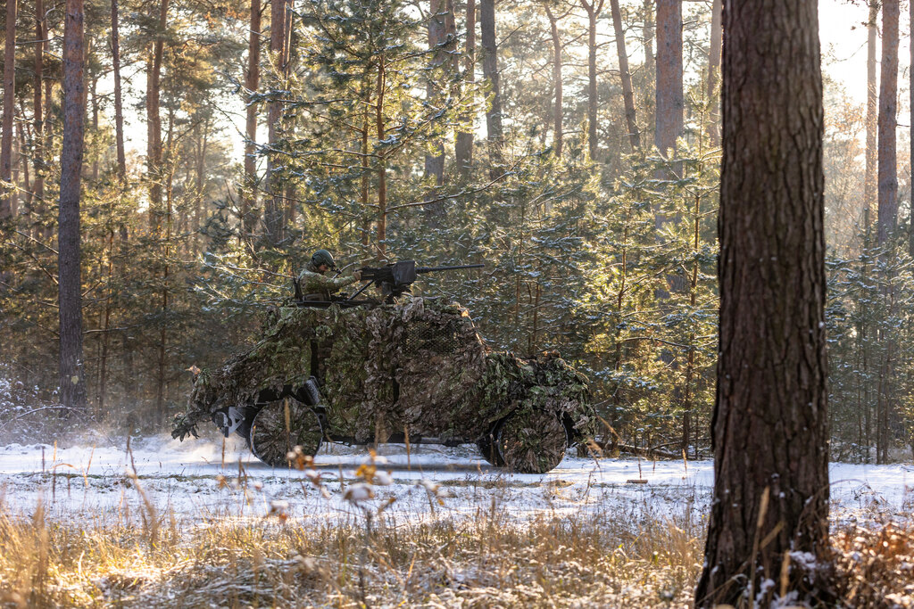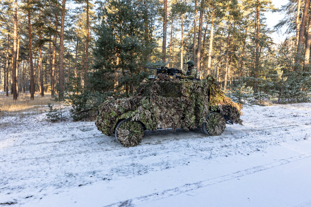 The system utilizes multispectral camouflage to reduce contrast in the visible spectrum while managing infrared signature. This makes the vehicle less detectable under night vision and thermal imaging. As a result, it blends more effectively into the surrounding environment and is harder to identify during ground or aerial reconnaissance.
