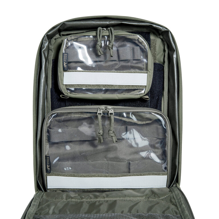 The backpack includes adjustable shoulder straps that can be used with an adapter for attachment to chest rigs or carriers. A rear MOLLE system allows mounting to compatible platforms, backpacks, or other load-bearing equipment, ensuring flexibility across different configurations.