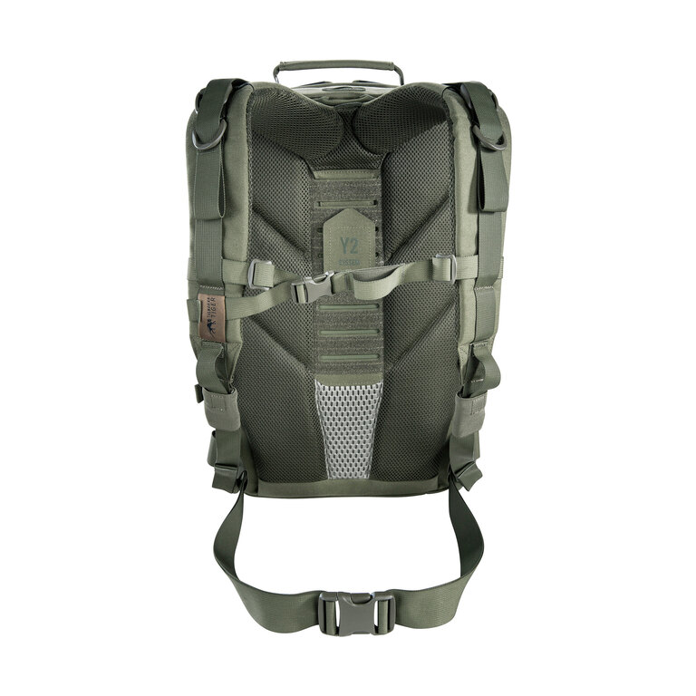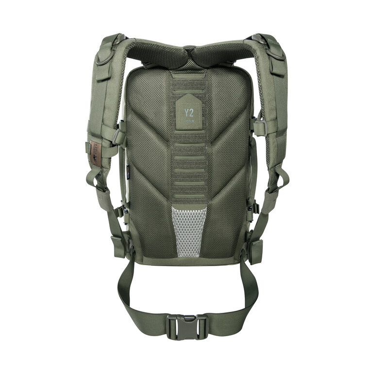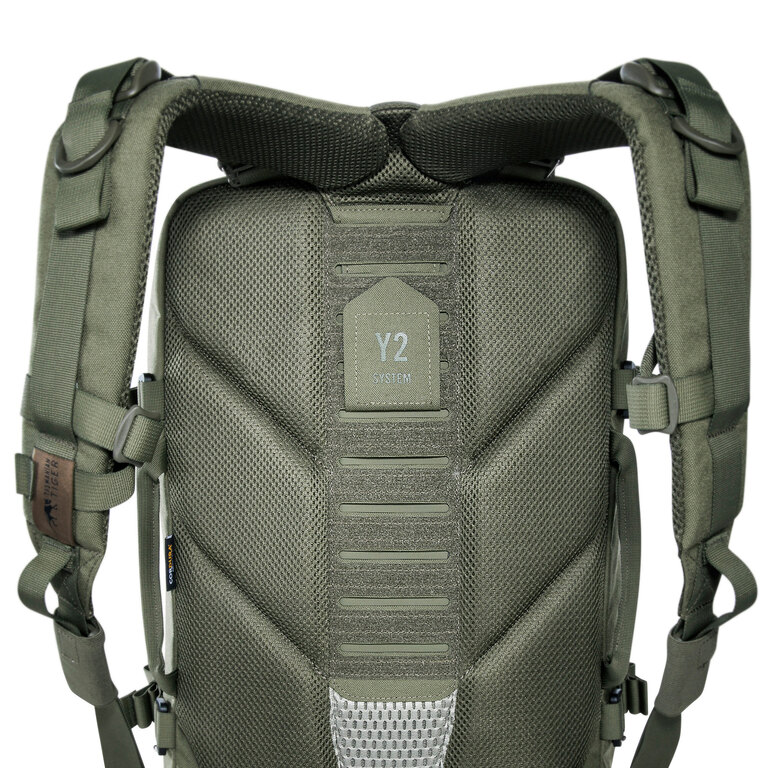 The Y2 carrying system is adjustable to torso length for improved fit. The chest strap is height-adjustable, and the hip belt can be adjusted or removed. Shoulder straps and the hip belt are fully detachable, making the pack suitable for transport in vehicles or specialized configurations.