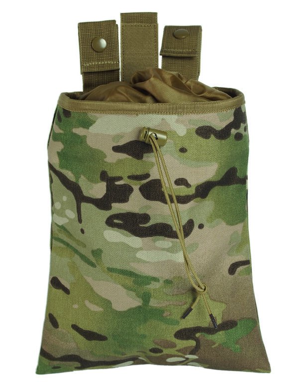 The pouch is designed to be easily attached to a belt, tactical vest, backpack, or other piece of gear with MOLLE binding. Velcro closure inside.It has one large storage pocket with an anti-snow flap and two drainage holes to drain moisture at the bottom.Allows to close quickly using a tightening elastic brake cord, so that the contents are not spilled even when running or other tactical activity.In case the pocket is empty, it can be rolled up and secured with an integrated Velcro belt.It doesn't take much room and fits in every pocket. Made of strong polyester with a PVC layer against moisture.