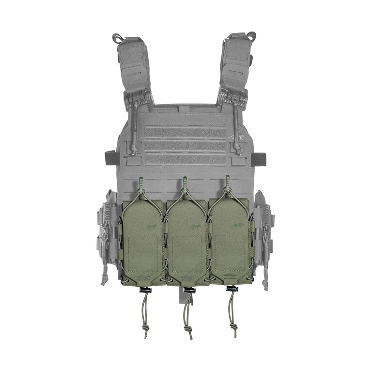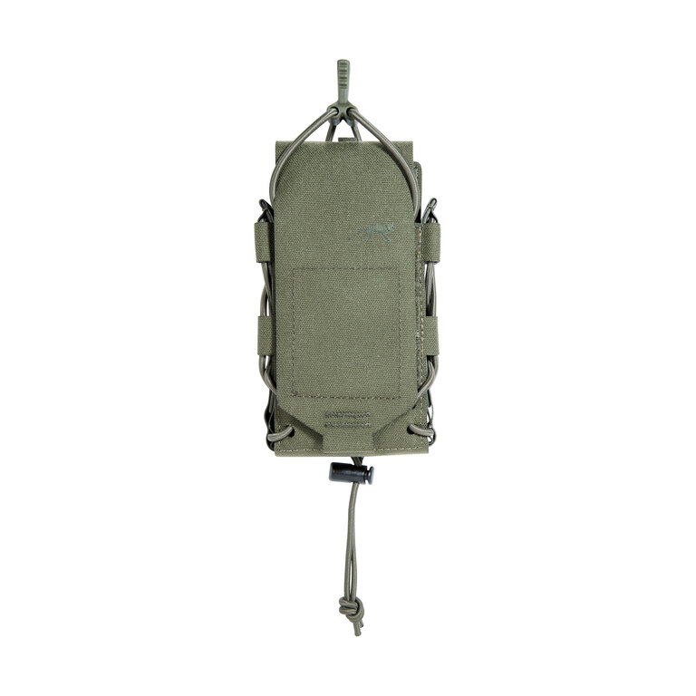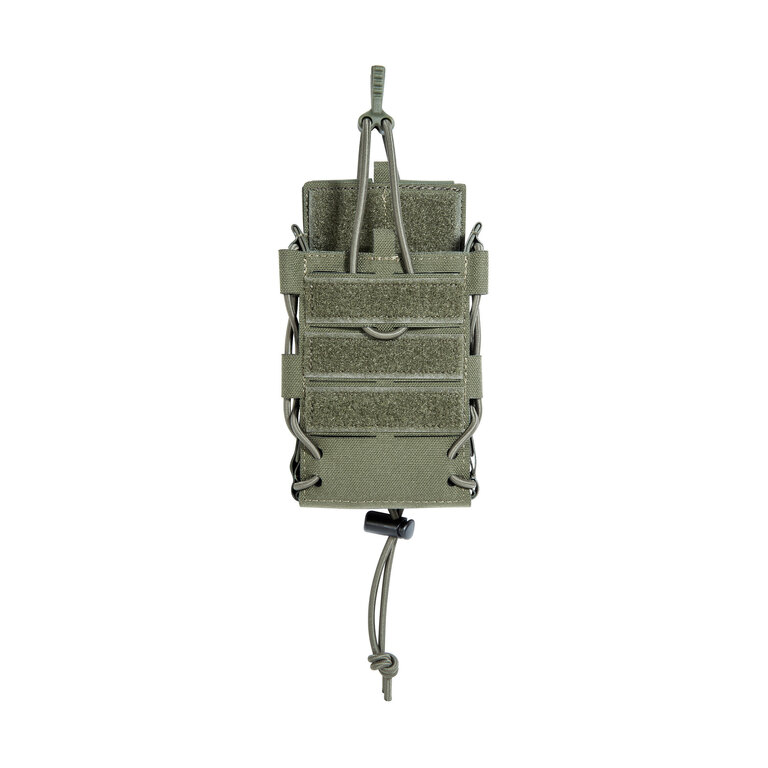 The flap with hook-and-loop closure gives quick, silent access in the field, while a side bungee with rear lock secures contents. The compression bungee is detachable, so retention can be tightened, loosened, or removed to suit the situation — saving time during reloads and minimizing noise.