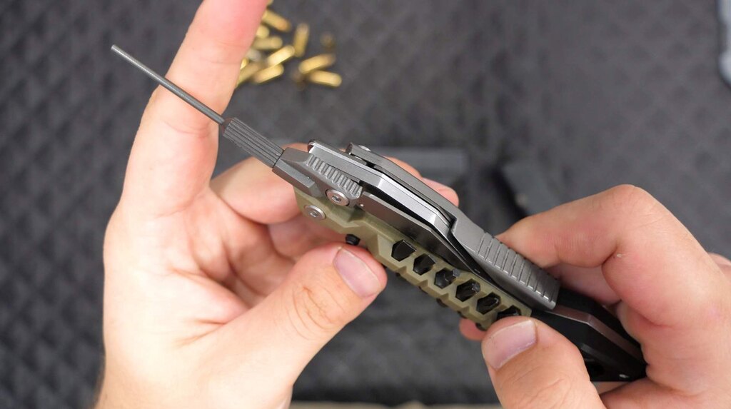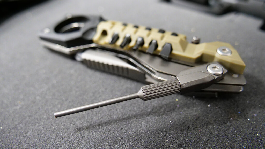 The multitool offers most of the tools a shooter might need. There is also a quality stainless steel knife that is enhanced with a titanium layer that enhances the knife's resistance and durability. Further in the multitool you will find a pin extruder, a screwdriver including 6 interchangeable bits, 4 imbus keys or keys for the 1911 pistols. The key is designed to cope with both officer and gouvernement bushings. You can use the back of the key as a makeshift hammer.