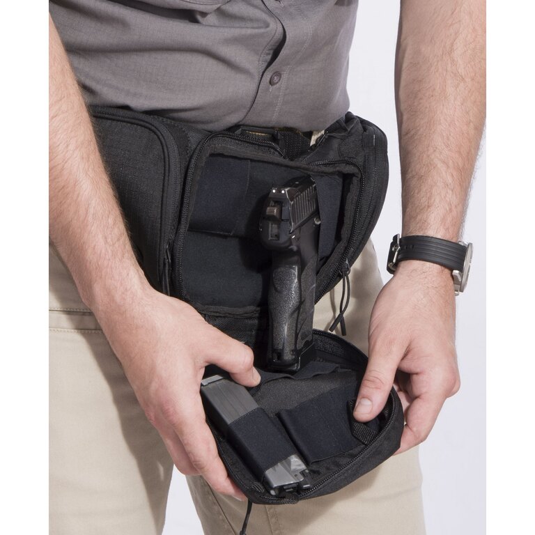 The barrel of the weapon can be held either to the left or to the right. The waist belt is fully adjustable and features quick release Duraflex buckle. All YKK zippers feature pull-up aids for easy operation with them.