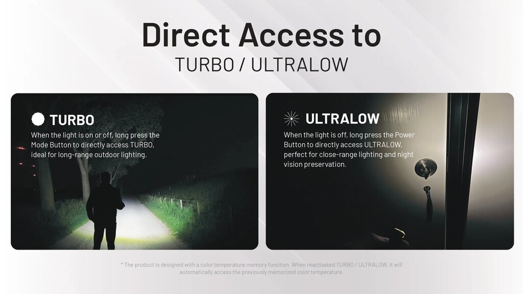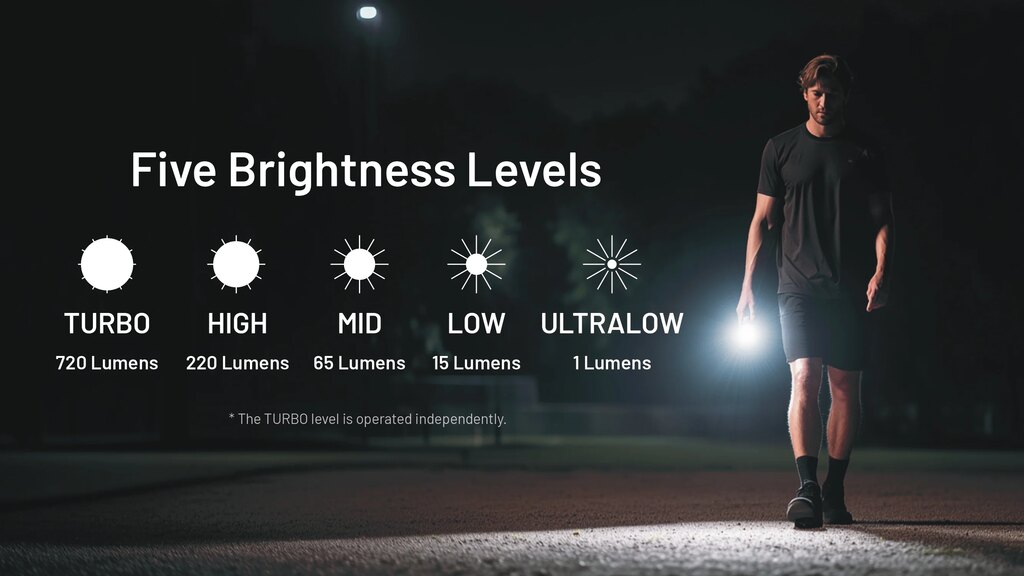 Two buttons control all functions with clear logic and quick access to maximum output. A low-output mode allows discreet illumination in enclosed spaces such as a tent or vehicle. The electronic lock prevents accidental activation during pocket or keychain carry.