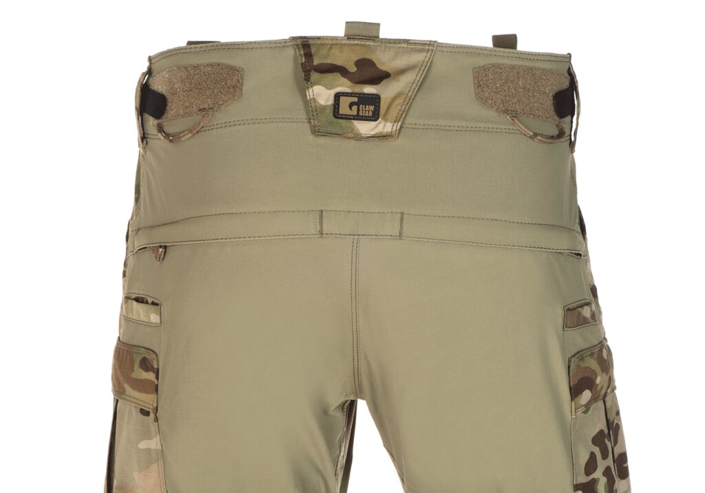 The trousers are equipped with pockets for knee pads insertion, which can hold a wide range of knee pads of various brands, such as these Clawgear. There are also buttonholes in the pockets to attach the top of the protector to the bottom, inserted inside the pocket. The knees of the trousers are made of an elastic mixture of polyamide, which is also water-repellent. The knee height can be adjusted using internal elastic cords with a stopper.
