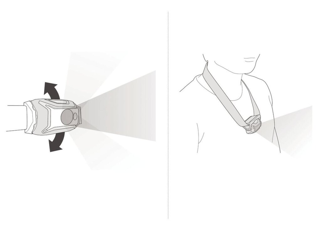 Just one button and the headlamp is ready. It's easy to switch between intensities even while on the move. The body of the headlamp can be easily tilted and directed where needed.